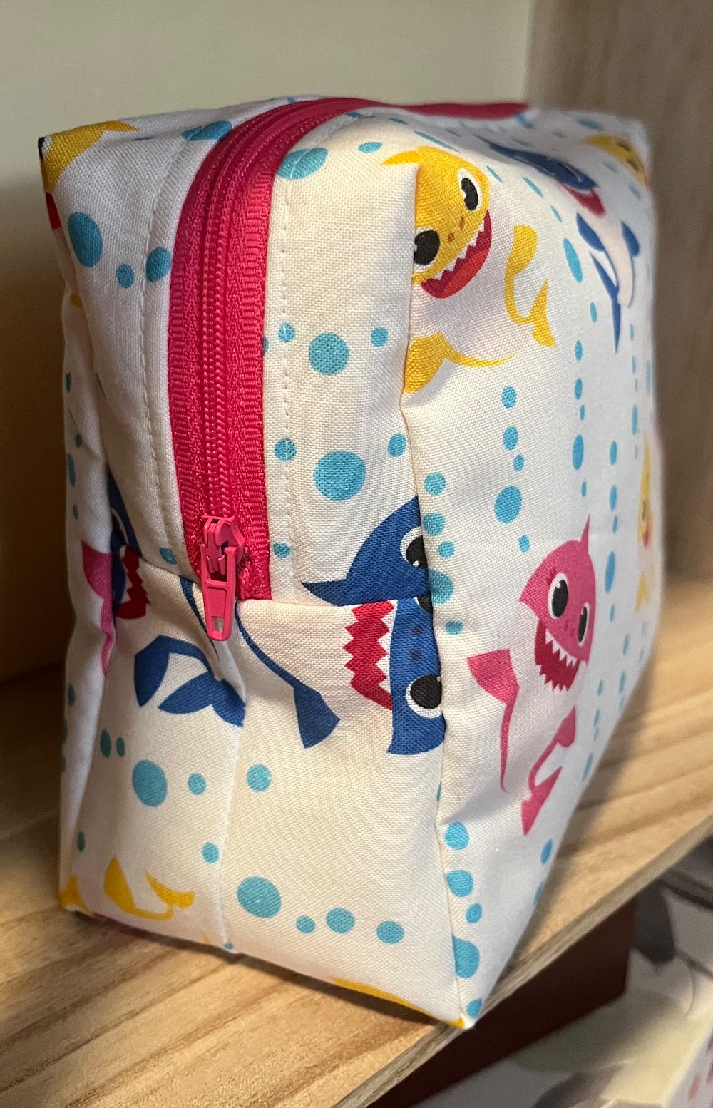 Dive into adorable organization with this handmade Baby Shark-themed cosmetic bag, designed to brighten your day and tidy your essentials. Featuring a cheerful pink zipper and crafted from soft quilting cotton, it’s the perfect splash of fun for makeup, travel, or diaper bag duty.
