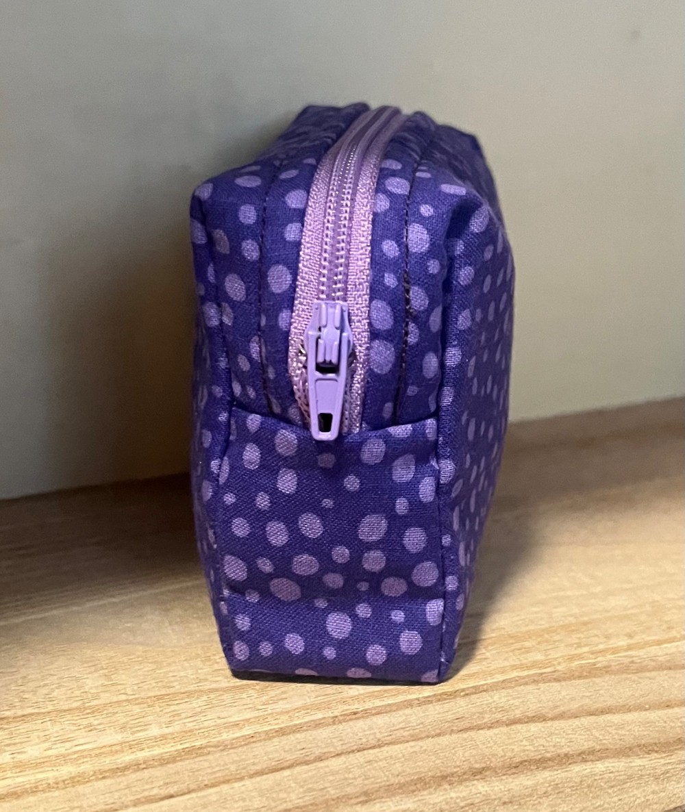 Add a pop of purple to your day with this handmade mini bag, featuring a whimsical bubble spot pattern on a rich purple background. Perfect for stashing lip balm, earbuds, coins, or other tiny treasures, this pouch is as functional as it is fun.
