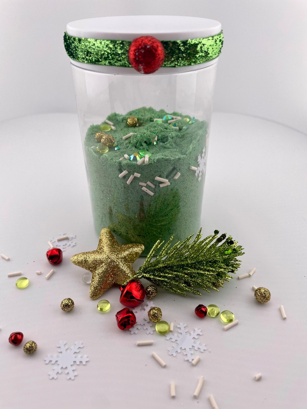 Decorated glass jar with 1 cup of Christmas Wreath–scented kinetic sand, accented with green glitter pine sprig, red jingle bells, gold star, mini snowflakes, sprinkles, and gold glitter balls for a festive holiday sparkle.