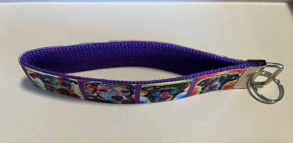 Celebrate the strength, charm, and personality of Pit Bulls with this handmade wristlet-style keychain, featuring a vibrant multi-color grosgrain ribbon design layered over rich deep purple cotton webbing. Itโs a durable, eye-catching accessory that keeps your keys close and your canine pride even closer.