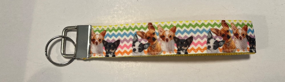 Wristlet Style Key Chain Multi-Color zig zag stripes and Chihuahua dogs Bright Yellow Cotton Webbing