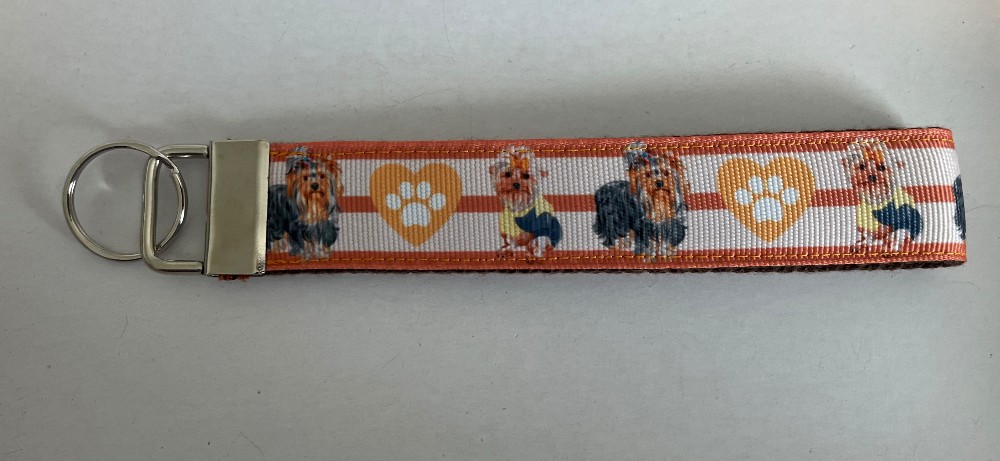 Wristlet Style Key Chain Yorkshire Terrier Dogs/Hearts, Paws, Stripes Grosgrain Ribbon Brown Cotton Webbing